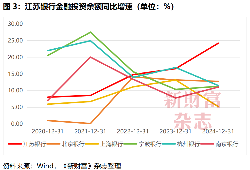 江苏银行的金融投资资产余额从2020年末的8459.08亿元增长至2024年末的1.53万亿元,5年复合增长率达到12.53%,2024年增速更达到24.2%,这助其当年资产增速达到16.12%,在17家上市城商行中排在首位。横向对比来看,宁波银行、杭州银行、南京银行、上海银行的金融投资余额同比增速有所减缓(图3)。