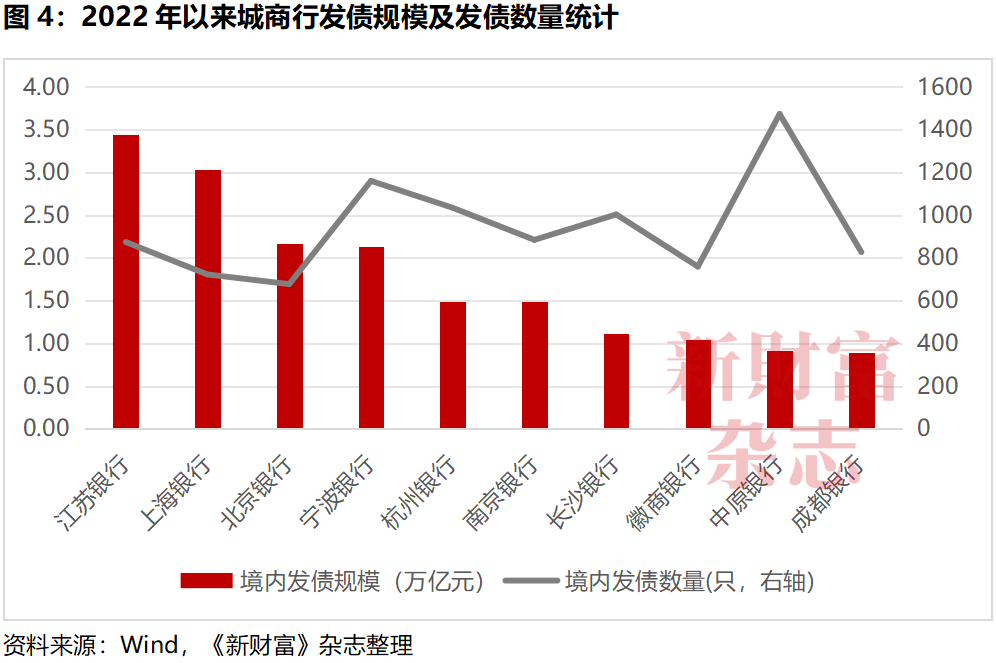 为补充资本,江苏银行近年频繁发债融资。2022—2024年,其发债规模位于城商行之首,达到3.44万亿元,排在第二的是上海银行(3.03万亿元),北京银行、宁波银行超过2万亿元、杭州银行、南京银行、长沙银行以及徽商银行超过1万亿元(图4)。