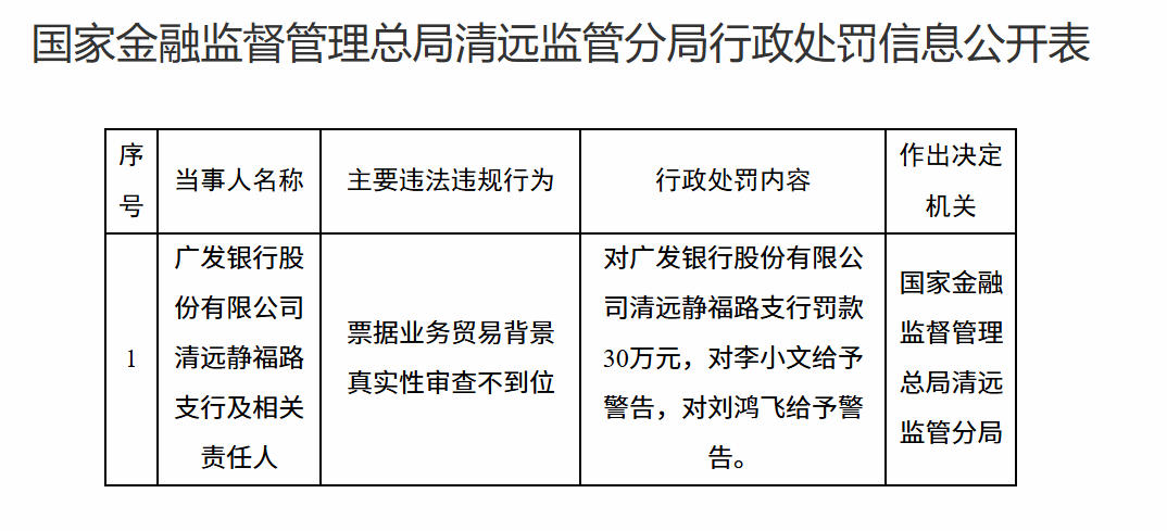12月10日,国家金融监督管理总局清远监管分局行政处罚信息公开表显示,广发银行股份有限公司清远静福路支行及相关责任人因票据业务贸易背景真实性审查不到位被罚款30万元,李某文、刘某费被警告。